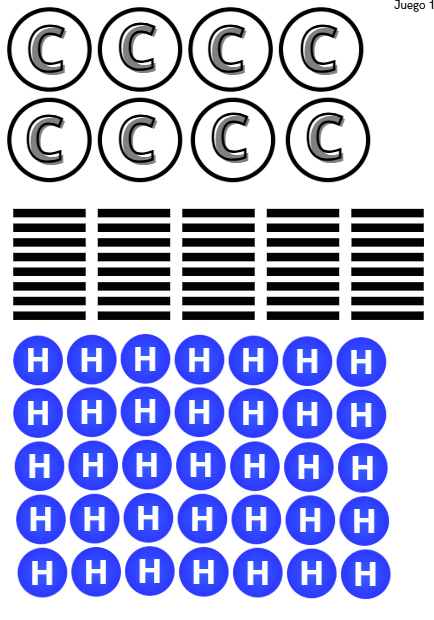 Juego 2: el puzle orgánico: cogen una tarjeta que les va a indicar que deben construir un compuesto orgánico (con enlaces y todo) con unas determinadas características