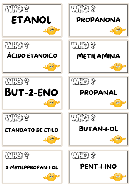 Juego 3: quien es quien?: tienen que adivinar, de entre los compuestos que tienen (en las tarjetas), el que ha elegido el otro equipo solo utilizando preguntas de si o no (estilo quien es quien)