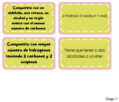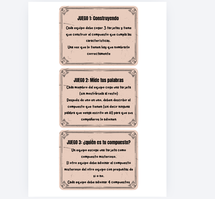 Juego 1: cuidado con lo que dices: tienen que describir el compuesto de la tarjeta a sus compañeros sin decir nada del nombre de este (estilo tabú)